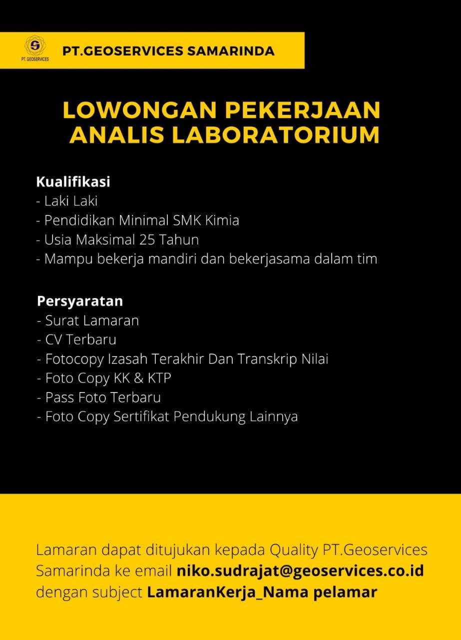 Ayoooo, bagi lulusan Kimia Analis dan Kimia Industri SMK Negeri 1 Bontang yang belum bekerja silahkan mendaftar lowongan di PT. Geoservice Samarinda, dengan syarat: